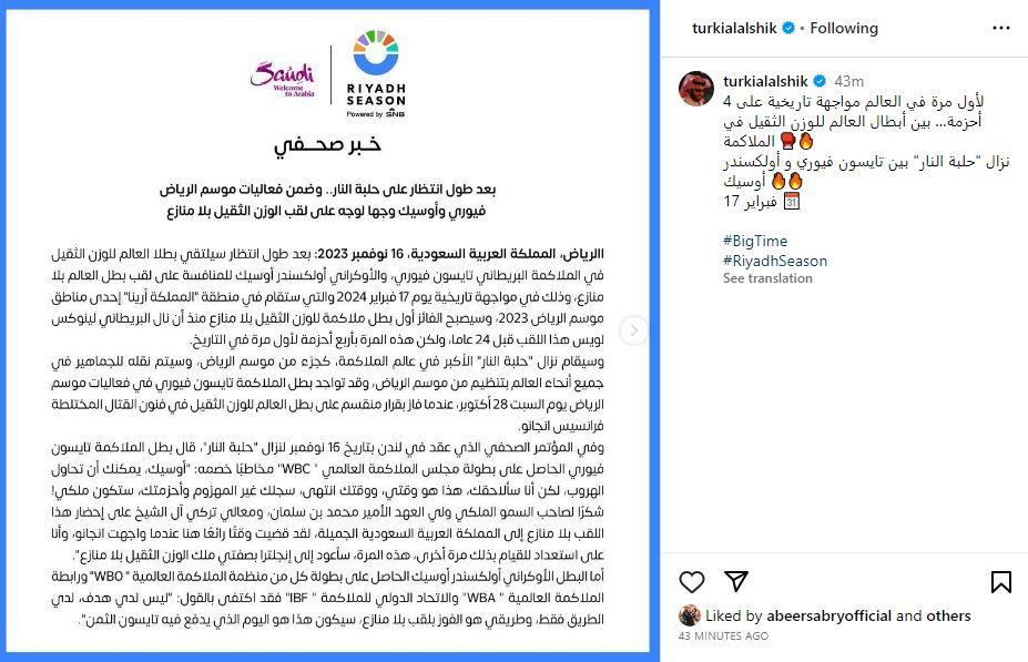 ونشر "آل الشيخ" بيان الهيئة عبر حسابه الرسمي على "إنستجرام"، وتضمن الآتي: "بعد طول انتظار سيلتقي بطلا العالم للوزن الثقيل في الملاكمة البريطاني تايسون فيوري، والأوكراني أولكسندر أوسيك للمنافسة على لقب بطل العالم بلا منازع، وذلك في مواجهة تاريخية يوم 17 فبراير 2024 والتي ستقام في منطقة المملكة أرينا إحدى مناطق موسم الرياض 2023.