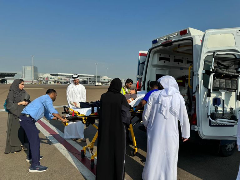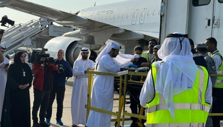 وحطت الطائرة القادمة من مطار العريش في جمهورية مصر العربية، في مطار أبوظبي، والتي تحمل على متنها الأطفال والذين هم في أمس الحاجة للمساعدة الطبية ممن يعانون من إصابات وحروق شديدة، ومرضى سرطان يحتاجون إلى علاج حثيث.
