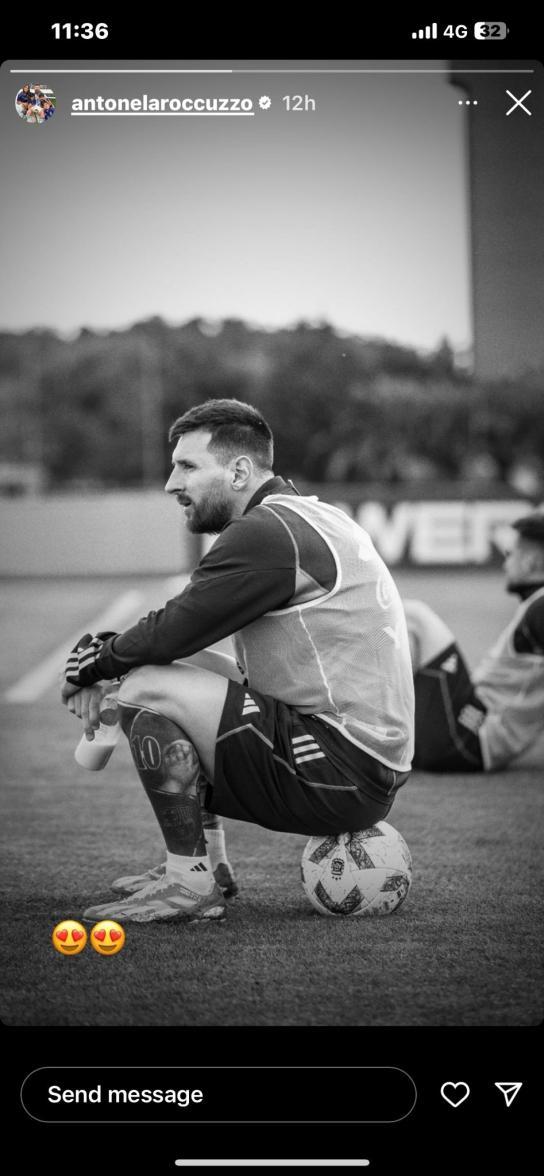 ونشرت أنتونيلا روكروزو، عبر حسابها على موقع إنستجرام، صورة لليونيل ميسي في المران الأخير للمنتخب الأرجنتيني خلال فترة الاستعداد قبل المباراة أمام البرازيل أثناء جلوسه على الكرة.