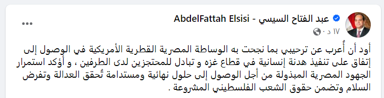 عرضت قناة إكسترا نيوز، خبرا عاجلا، يفيد بأن الرئيس المصري عبد الفتاح السيسي، كتب على صفحته الشخصية بمواقع التواصل الاجتماعي، “أُعرب عن ترحيبي بما نجحت به الوساطة المصرية القطرية الأمريكية في الوصول إلي اتفاق تنفيذ هدنة إنسانية في قطاع غزة وتبادل للمحتجزين لدى الطرفين”.