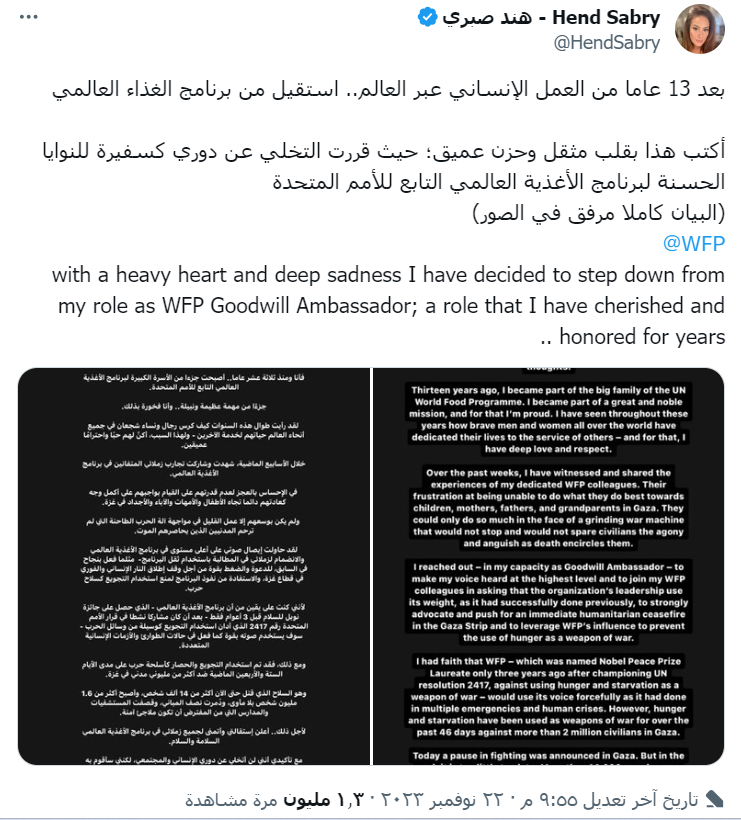 وقالت هند صبري في تدوينة على مواقع التواصل الاجتماعي "أكتب هذا بقلب مثقل وحزن عميق، حيث قررت التخلي عن دوري كسفيرة للنوايا الحسنة لبرنامج الأغذية العالمي التابع للأمم المتحدة، وهو الدور الذي أعتز به وألعبه منذ سنوات".