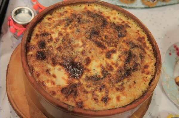 - أضيفي القشطة على سطح الطاجن وفوقها قطع اللحم المسلوق، ثم غلفي الطاجن بورق الفويل.