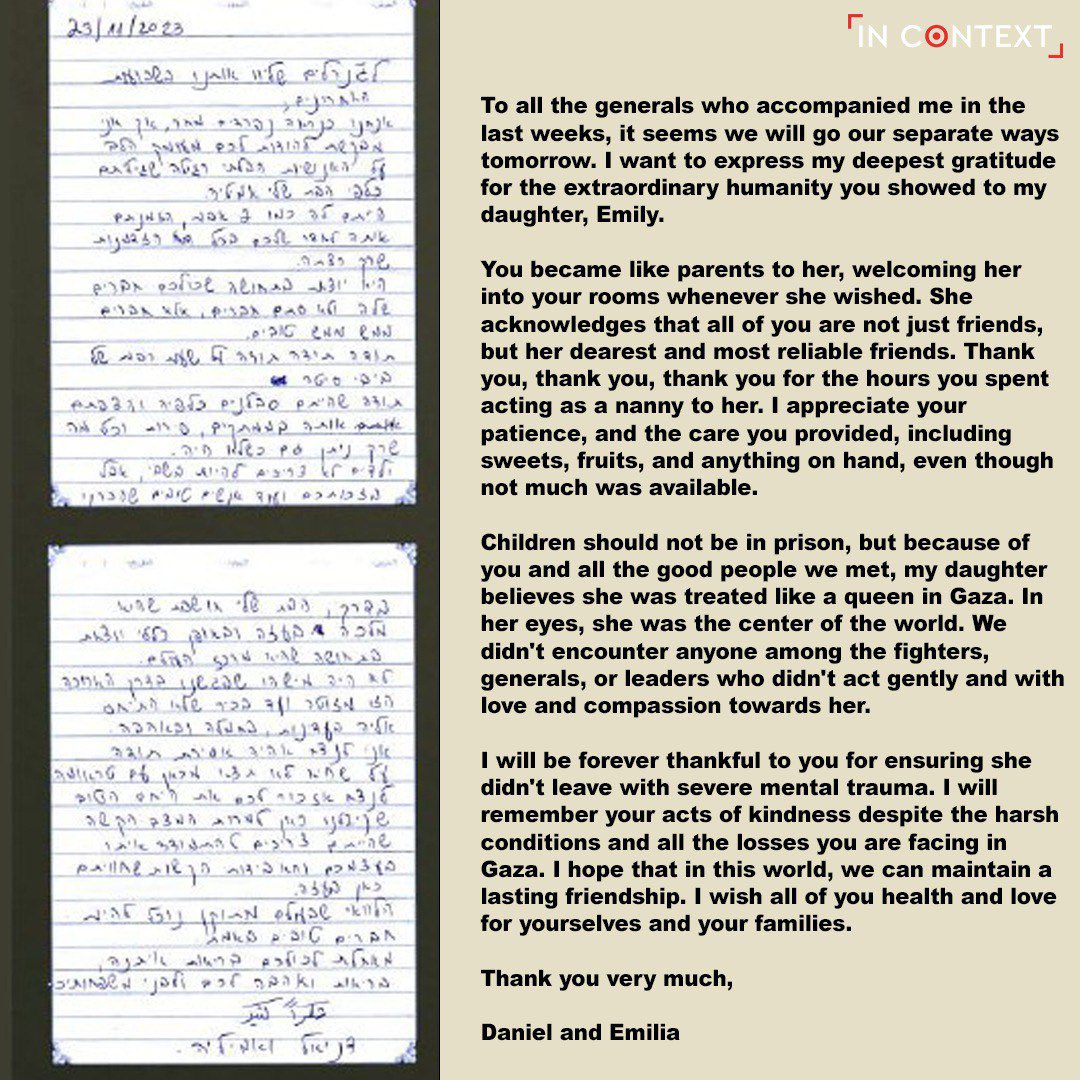 وقالت دانيال في الرسالة: "إلى الجنرالات الذين رافقونني في الأسابيع الأخيرة، يبدو أننا سنفترق غدا، لكنني أشكركم من أعماق قلبي على إنسانيتكم غير الطبيعية التي أظهرتموها تجاه ابنتي إيمليا، كنتم لها مثل الأبوين دعوتموها لغرفتكم في كل فرصة أرادتها، هي تعترف بالشعور بأنكم كلكم أصدقاؤها ولستم مجرد أصدقاء، وإنما أحباب حقيقيون جيدون، شكرا شكرا شكرا على الساعات الكثيرة التي كنتم فيها كالمربية".