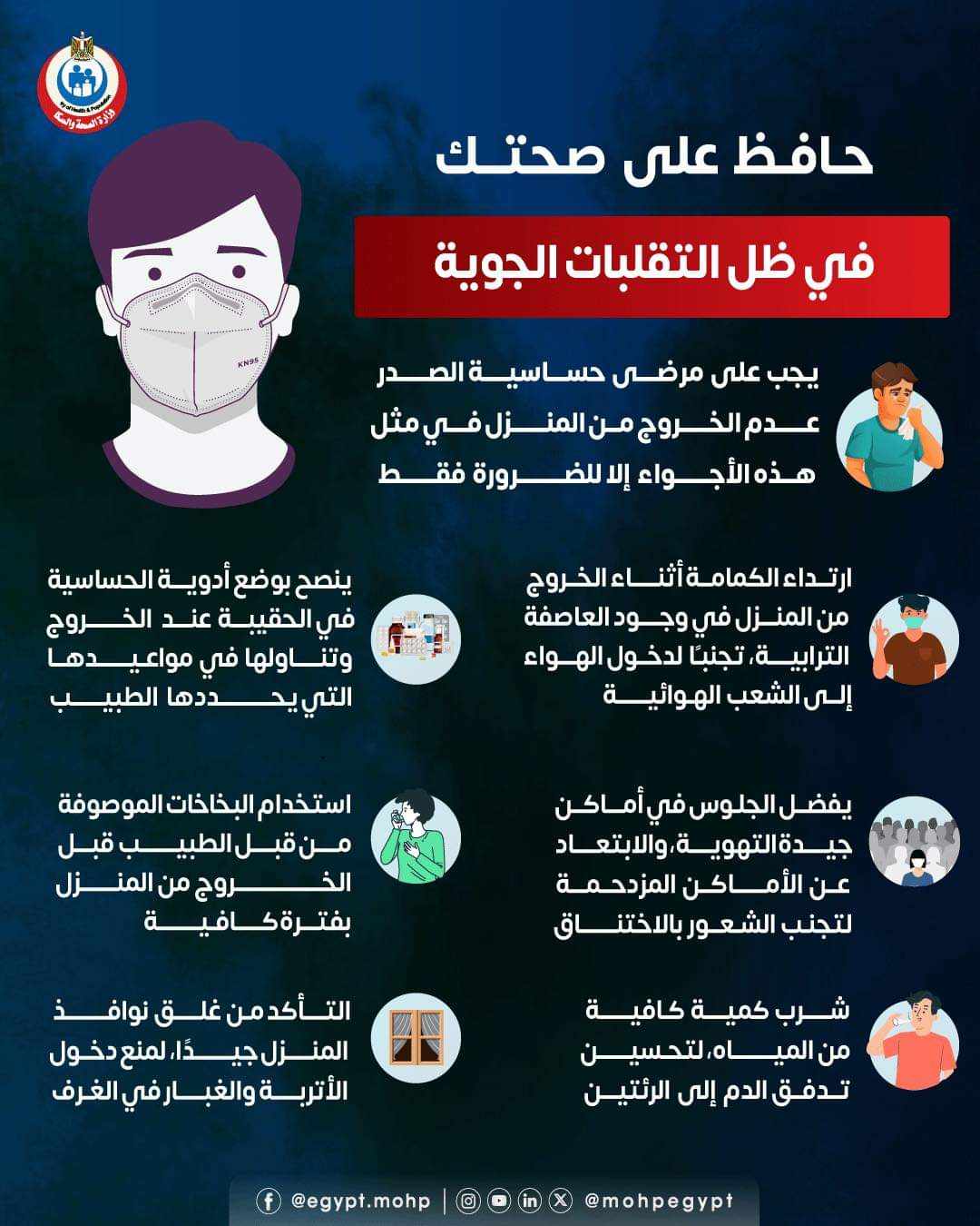 - ارتداء الكمامة أثناء الخروج خصوصا إذا تواجدت عاصفة ترابية تجنبا لدخول الهواء إلى الشعب الهوائية.