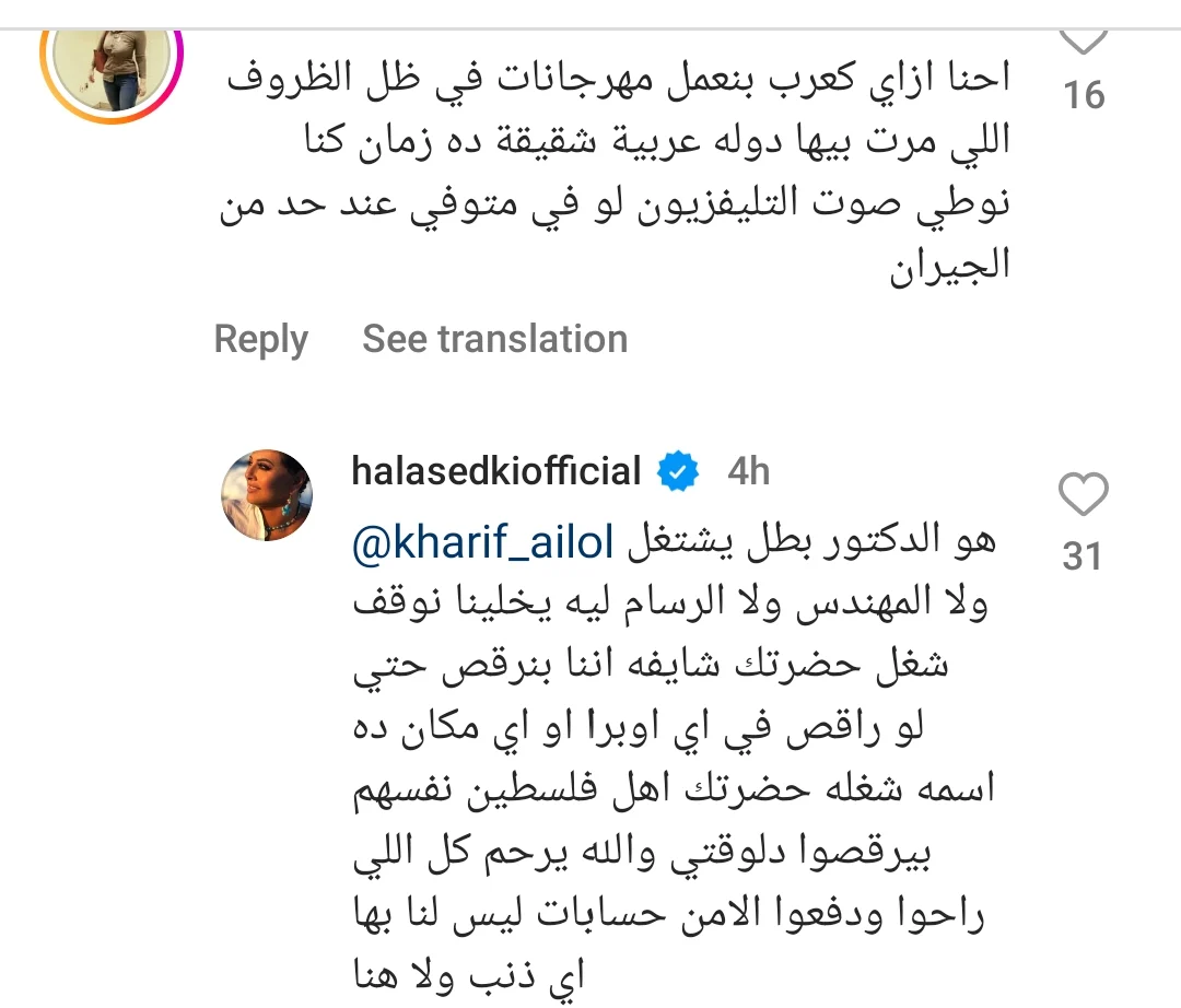 بينما تعرضت هالة صدقي للنقد من أحد المتابعين، الذي علق على الصورة: احنا ازاي كعرب بنعمل مهرجانات في ظل الظروف اللي مرت بيها دولة عربية شقيقة، ده زمان كنا نوطي صوت التليفزيون؛ لو في متوفي عند حد من الجيران، لترد عليه قائلة: هو الدكتور بطل يشتغل؟ ولا المهندس؟ ولا الرسام؟، ليه يخلينا نوقف شغل، حضرتك شايف إننا بنرقص حتى؟، لو راقص في أي أوبرا أو أي مكان، ده اسمه شغله حضرتك، أهل فلسطين نفسهم بيرقصوا دلوقتي، والله يرحم كل اللي راحوا ودفعوا التمن، حسابات ليس لنا بها أي ذنب ولا هنا.