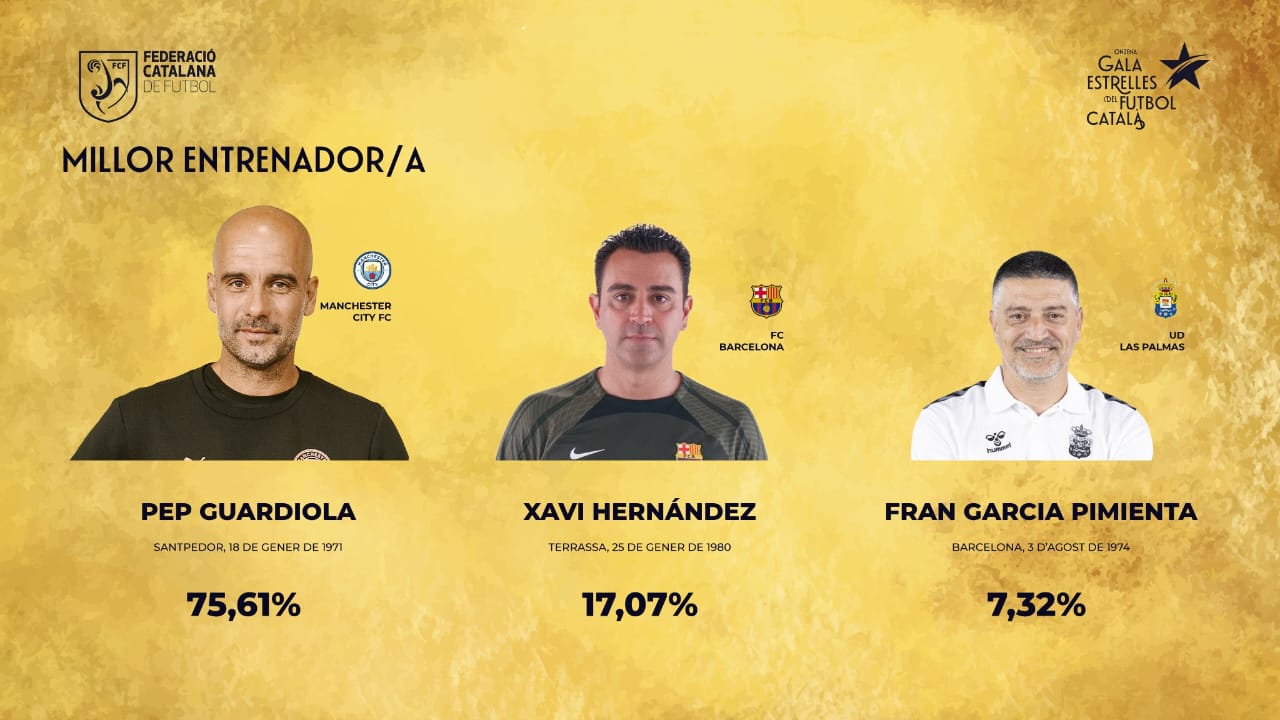 حصد المدرب الإسباني بيب جوارديولا، المدير الفني لفريق مانشستر سيتي الإنجليزي، جائزة أفضل مدرب كتالوني لعام 2023، متفوقا على مواطنه تشافي هيرنانديز، مدرب برشلونة الإسباني.