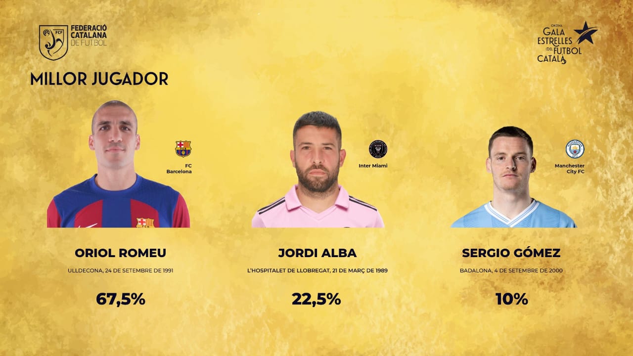 كما أعلن اتحاد الكرة في إقليم كتالونيا فوز أوريول روميو، لاعب وسط برشلونة، بجائزة أفضل لاعب كتالوني في 2023، بنسبة 76.5% من الأصوات، متفوقا على جوردي ألبا، ظهير برشلونة السابق ولاعب إنتر ميامي الأمريكي الحالي، وسيرجيو جوميز لاعب مانشستر سيتي.