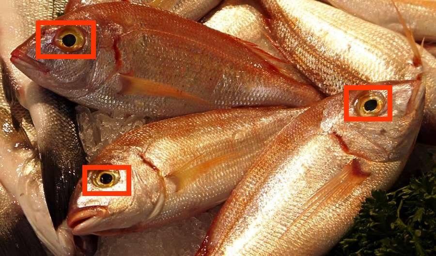 عيون السمك الطازجة لامعة وواضحة وبارزة، بينما عيون السمك الغائمة أو المطموسة، تعني أن السمك قد بدأ في الفساد.