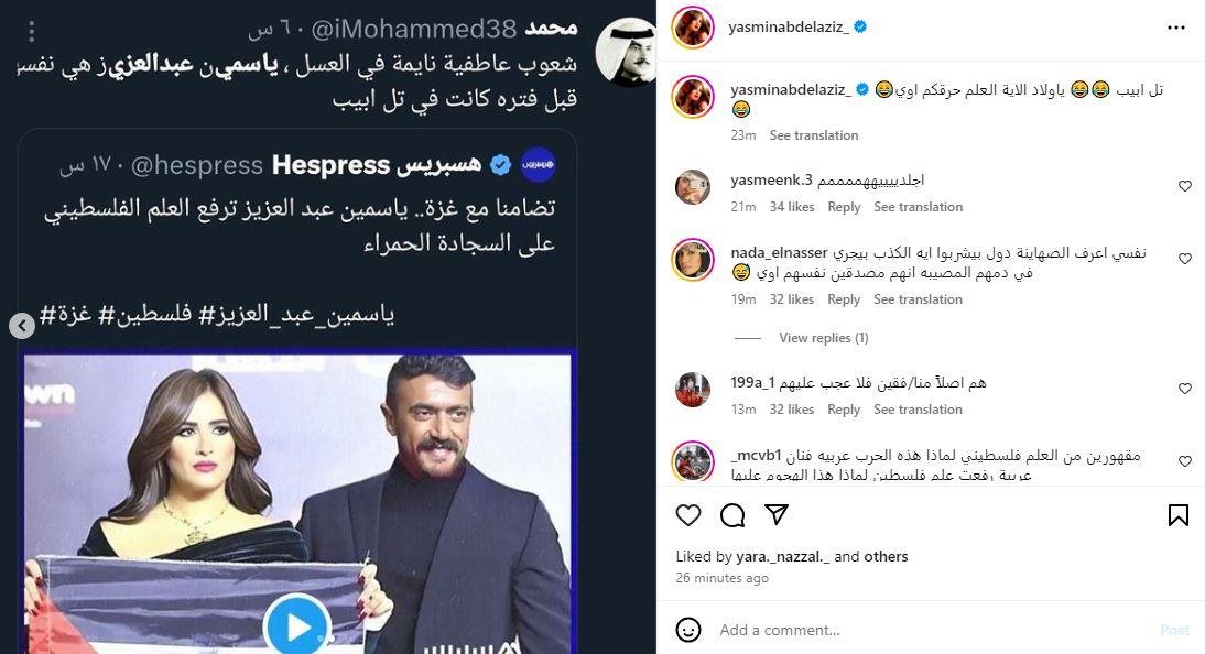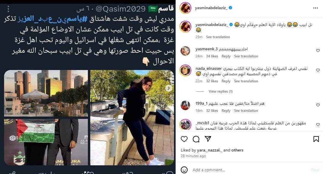 شاركت ياسمين عبد العزيز عبر حسابها الرسمي بموقع تداول الصور والفيديوهات إنستجرام، صورة لمنشور أحد منتقديها على موقع إكس" تويتر سابقًا قائلًا: مدري ليش وقت شفت الهاشتاق تذكر وقت كانت في تل أبيب ممكن علشان الأوضاع المؤلمة في غزة ممكن انتهى شغلها في إسرائيل واليوم تحب أهل غزة بس حبيت احط صورتها وهي في تل أبيب سبحان الله مغير الأحوال.