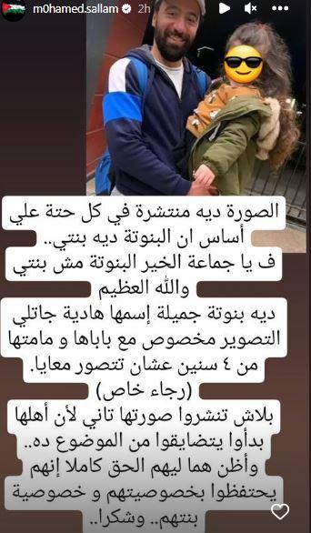 ونشر سلام، صورته مع الطفلة، عبر "ستوري" حسابه على إنستجرام، وعلق: "الصورة دي منتشرة في كل حتة على أساس أن البنوتة دي بنتي.. يا جماعة الخير البنوتة مش بنتي والله العظيم".