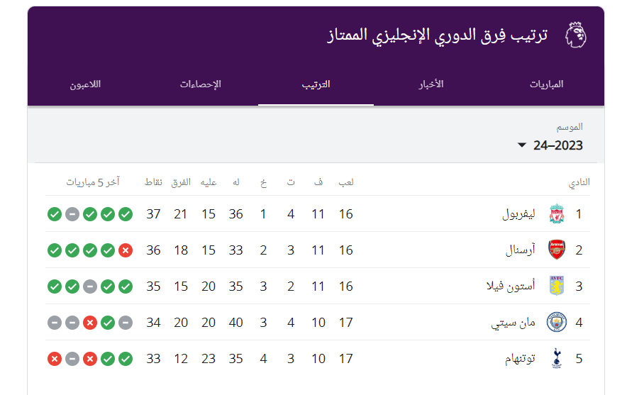 جدول ترتيب الدوري الإنجليزي 2023 حتى الآن