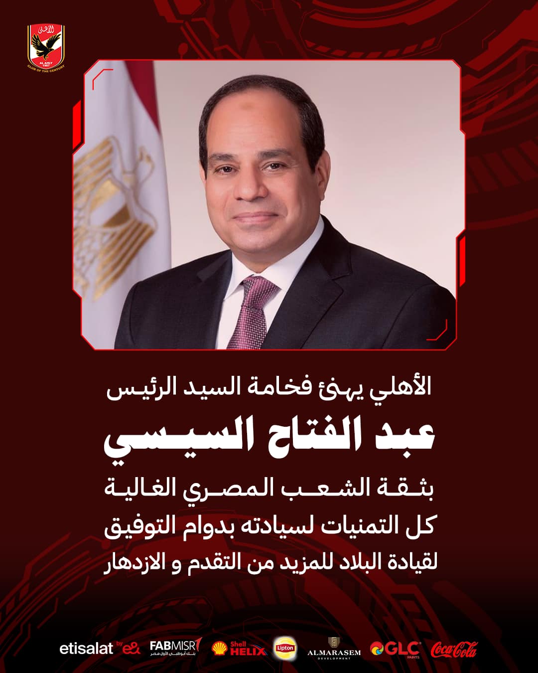 قدم النادي الأهلي التهنئة إلى الرئيس المصري عبد الفتاح السيسي، بمناسبة فوزه في الانتخابات الرئاسية لعام 2024.