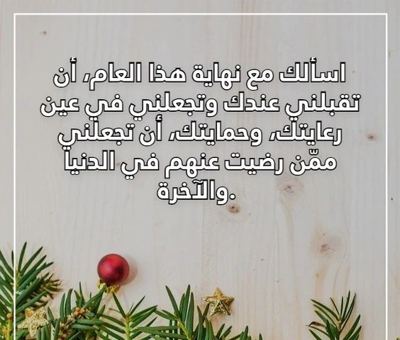 - اللهم اجعل نهاية هذه السنة بداية لفرح ونهاية لكل هم وغم وضيق، اللهم بارك لنا فيما هو آت واغفر لنا ما مضى من عمرنا. اللهم لا تجعل هذه السنة ترحل إلا ونحن ساجدون لك من عظم ما رزقتنا به. اللهم اجعل نهاية هذه السنة فرحة لنا ولمن نحن وبارك لنا في أولادنا وأهَلْنا واغفر لمن مات منا يا رب العالمين.