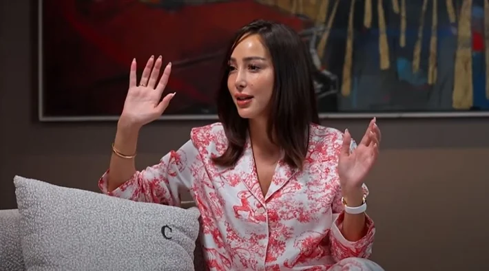 وارتدت بسمة بوسيل بدلة حرير بشكل البيجاما وبأكمام طويلة وبتصميم الأوفر سايز، باللون الأبيض العاجي وبعض الخطوط باللون الأحمر.