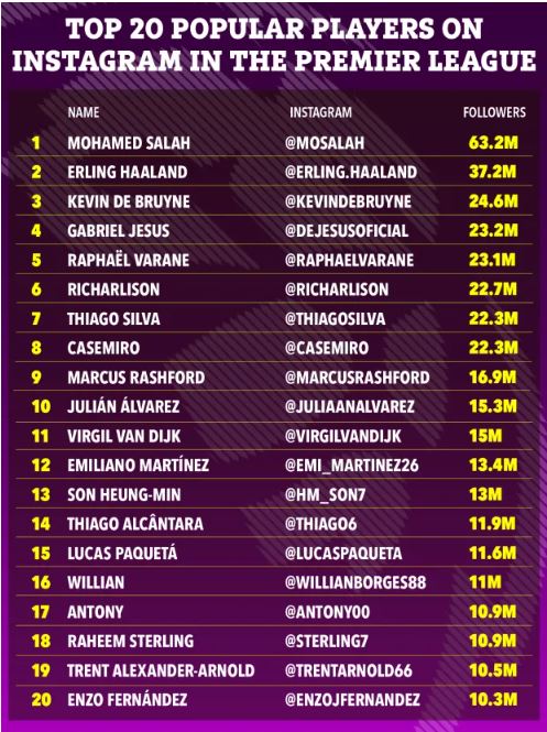 قائمة أكثر اللاعبين متابعة عبر إنستجرام في الدوري الإنجليزي: