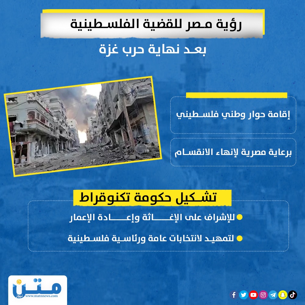 رؤية مصر للقضية الفلسطينية بعد نهاية حرب غزة (انفوجراف) رؤية مصر الإثنين 25/ديسمبر/2023 - 09:34 م 12/25/2023 9:34:58 PM انفوجراف متن محمد حسن شارك طباعة - إقامة حوار وطني فلسطينيبرعاية مصرية لإنهاء الانقسام- تشكيل حكومة تكنوقراطللإشراف على الإغاثة وإعادة الإعمار- التمهيد لانتخابات عامة ورئاسية فلسطينية شارك حرب غزة الفلسطينى فلسطيني إنفوجراف انتخابات مصر إنتخاب