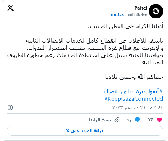 وقالت في بيان عبر صفحاتها الرسمية بمواقع التواصل الاجتماعي "إكس": «أهلنا الكرام في الوطن الحبيب، نأسف للإعلان عن انقطاع كامل لخدمات الاتصالات الثابتة والإنترنت مع قطاع غزة الحبيب، بسبب استمرار العدوان».