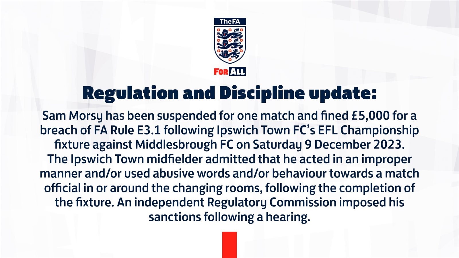 ووفقًا للبيان الرسمي تم اتهام قائد نادي إبسويتش تاون، بانتهاك قاعدة الاتحاد الإنجليزي E3.1 بعد الفوز على ميدلسبره في 9 ديسمبر.