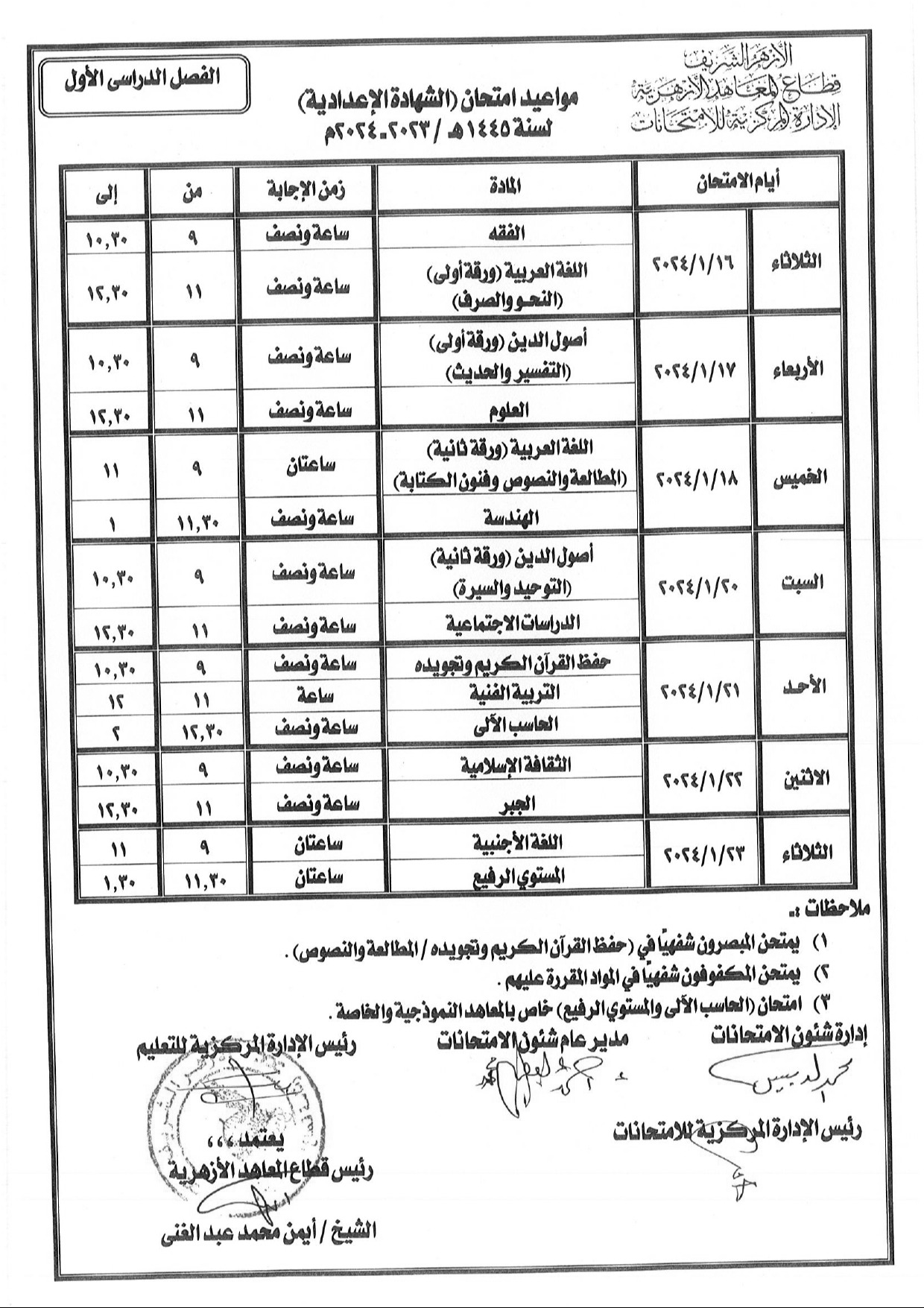 اعتمد قطاع المعاهد الأزهرية، جدول الشهادة الإعدادية الأزهرية الترم الأول 2024 لسنة 1445 هجريا، حيث تنطلق الامتحانات يوم الثلاثاء الموافق 16 يناير 2024، وتستمر لمدة 7 أيام متتالية عدا يوم الجمعة، لتنتهي امتحانات الصف الثالث الإعدادي الأزهري يوم الثلاثاء الموافق 23 يناير 2024.