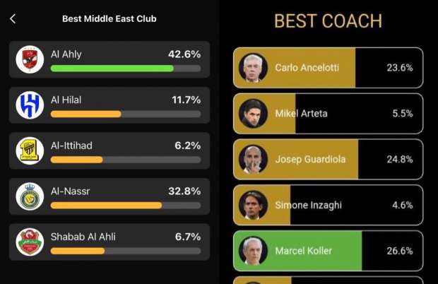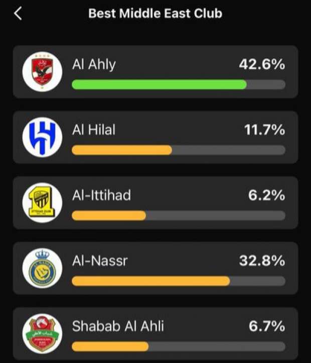 وجاء الأهلي في المركز الأول بنسبة 42% من إجمالي الأصوات، بعد غلق التصويت ظهر اليوم، وحل النصر في المرتبة الثانية بنسبة 33%، فيما احتل الهلال السعودي المركز الثالث، وفي المركز الرابع جاء شباب الأهلي الإماراتي.