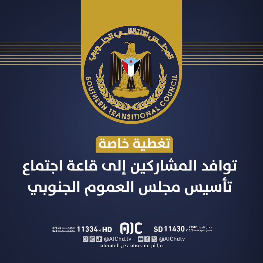 أعلنت قناة عدن المستقلة AIC عن تغطية خاصة لمجلس العموم الجنوبي بعدن تحت بعنوان "توافد المشاركين إلى قاعة اجتماع تأسيس #مجلس_العموم_الجنوبي".