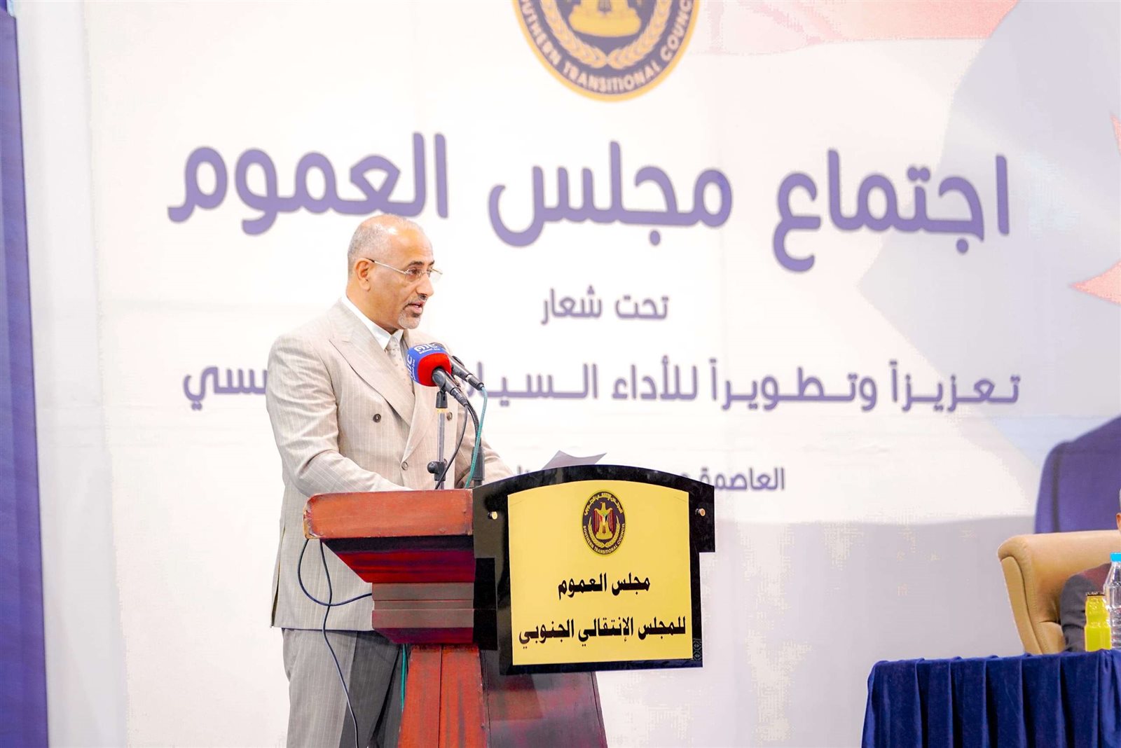 ها أنتم اليوم تدشنون من العاصمة عدن، الاجـتماع التأسيـسي لمـجلس العموم الذي يضم (هيئة الرئاسة، والجمعية الوطنية، ومجلس المستشارين، والهيئة التنفيذية العليا) تجسدون الاصطفاف الوطني الجنوبي، لتعزيز الأداء السياسي والبناء المؤسسـي على طريق استعادة وبناء دولتنا الجنوبية الفيدرالية المستقلة.... تقع عليكم مسؤولية كبيرة في هذه اللحظة الحاسمة، تستوجب تكثيف الجهود وحشد الطاقات والإمكانات لخدمة شعبنا والانتصار لمشروعه الوطني.