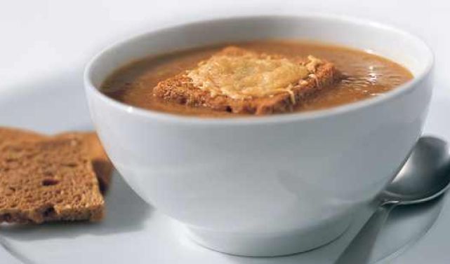 - والآن بي شوربة البصل في أطباق التقديم وضعي على سطح كل طبق قطع من التوست المحمص المذاب فيه الجبنة الصفراء.
