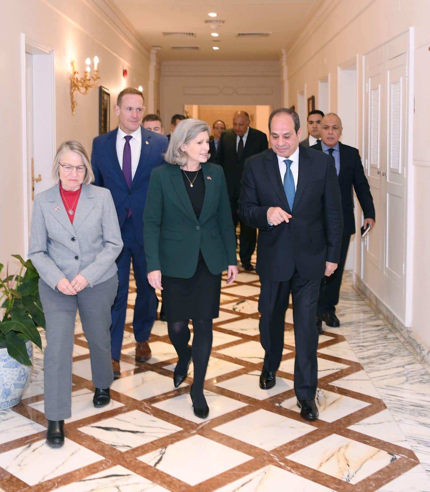 وأضاف المتحدث الرسمي أن اللقاء شهد حوارًا مفتوحًا بين الرئيس والوفد الأمريكي بشأن تطورات المشهد الإقليمي، لا سيما في قطاع غزة، حيث استعرض السيد الرئيس السياق العام للأوضاع الحالية، مشددًا على ضرورة العمل بجدية على التسوية العادلة والشاملة للقضية الفلسطينية، من خلال إقامة الدولة الفلسطينية المستقلة وفقًا للمرجعيات المعتمدة، مؤكدًا أن الأولوية الراهنة تتمثل في التوصل إلى وقف إطلاق النار وحماية المدنيين، ونفاذ المساعدات الإغاثية بالكميات الكافية لمواجهة المأساة الإنسانية التي يواجهها أهالي القطاع، اتساقًا وتنفيذًا للقرارات الأممية ذات الصلة. كما شدد السيد الرئيس على رفض مصر التام لمحاولات تصفية القضية الفلسطينية من خلال تهجير الفلسطينيين من أراضيهم.