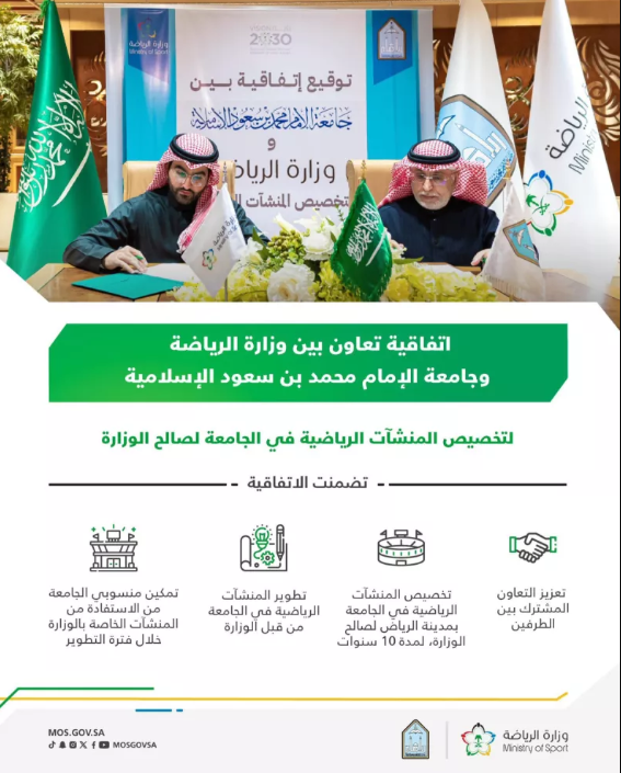 أعلنت وزارة الرياضة السعودية، توقيع اتفاقية مع جامعة الإمام محمد بن سعود الإسلامية، لتخصيص المنشآت الرياضية في الجامعة لصالح الوزارة.