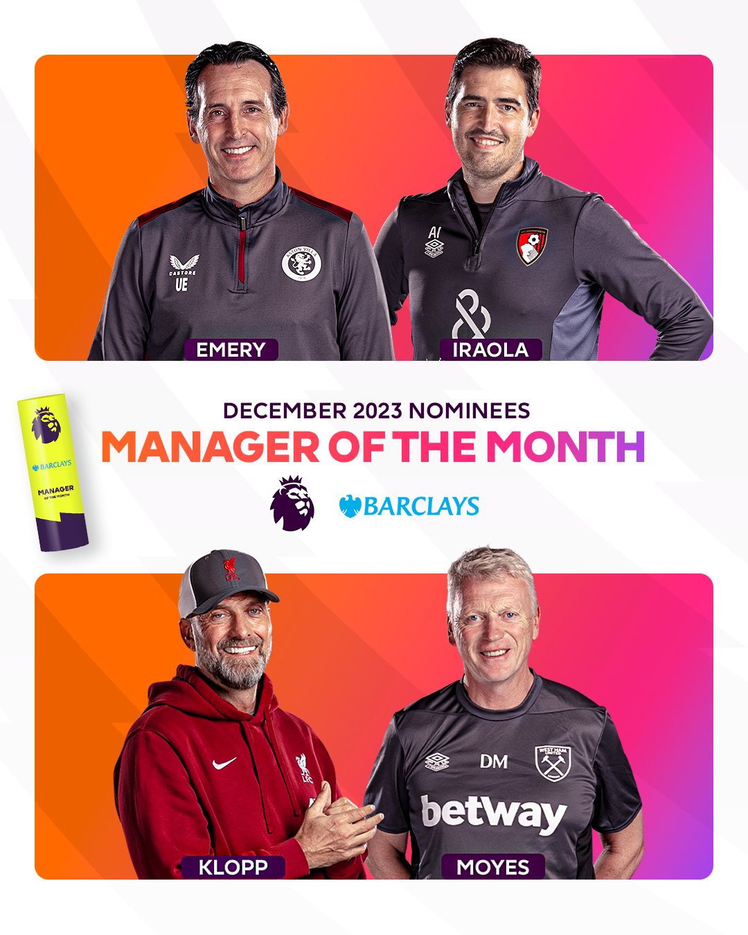 وضمت القائمة 4 مدربين هم الألماني يورجن كلوب المدير الفني لفريق ليفربول، والإسباني أوناي إيمري مدرب أستون فيلا، متصدر ووصيف ترتيب الدوري الإنجليزي الممتاز للموسم الحالي 2023/2024.