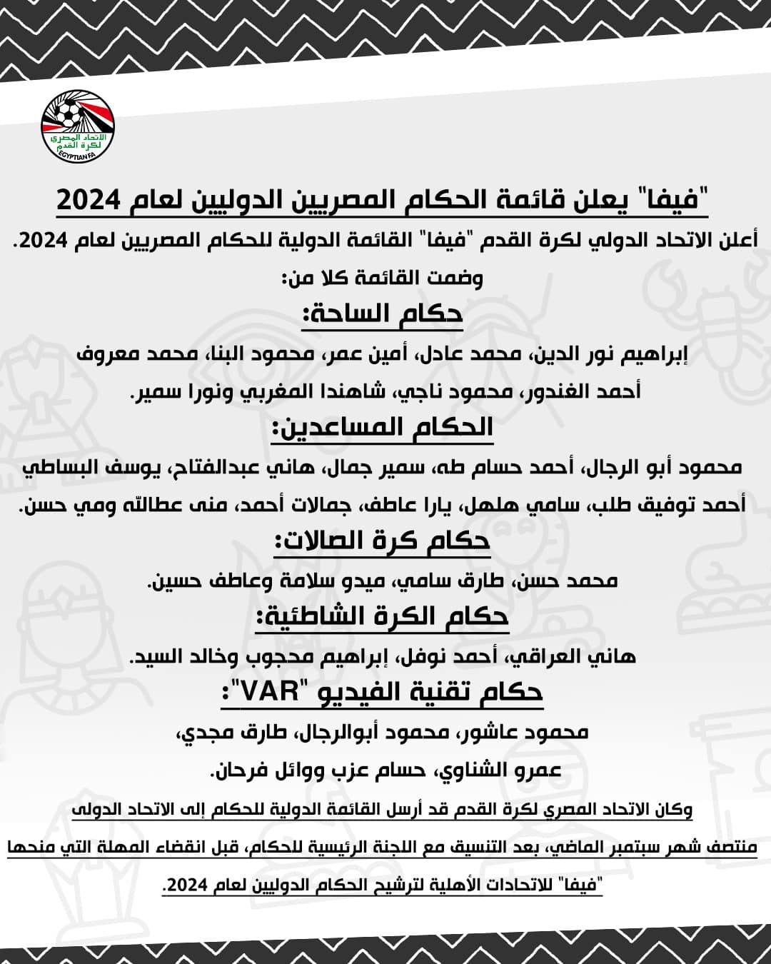 وكان الاتحاد المصري لكرة القدم أرسل القائمة الدولية للحكام إلى الاتحاد الدولي، منتصف شهر سبتمبر الماضي، بعد التنسيق مع اللجنة الرئيسية للحكام، قبل انقضاء المهلة التي منحها "فيفا" للاتحادات الأهلية لترشيح الحكام الدوليين لعام 2024.