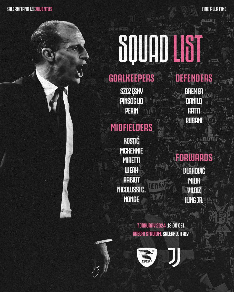 أعلن ماسيمليانو أليجري المدير الفني لفريق يوفنتوس، عن القائمة الرسمية للسيدة العجوز في مواجهة نظيره ساليرنيتانا المقررة غدا الأحد، على ملعب "أريكي"، وذلك ضمن منافسات الجولة التاسعة عشرة من الدوري الإيطالي.