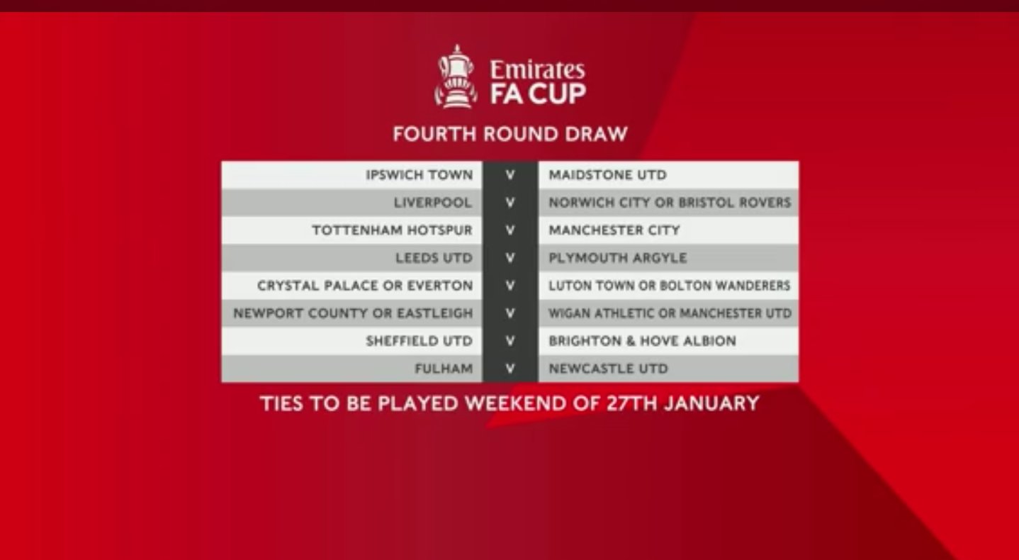 وأسفرت قرعة الدور الرابع من كأس الاتحاد الإنجليزي عن مواجهة نارية بين فريقي مانشستر سيتي وتوتنهام، بينما يصطدم تشيلسي مع أستون فيلا في حين يلتقي ليفربول الفائز من مباراة نورويتش سيتي وبريستول روفرز.