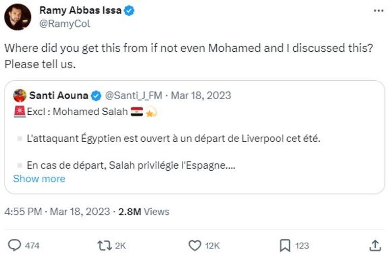 وأعاد وكيل صلاح نشر تغريدة سانتي أونا وقتها ليرد قائلا: "من أين أتيت بهذا، إذا لم نكن أنا ومحمد قد ناقشنا هذا الأمر؟ أرجوك أخبرنا".