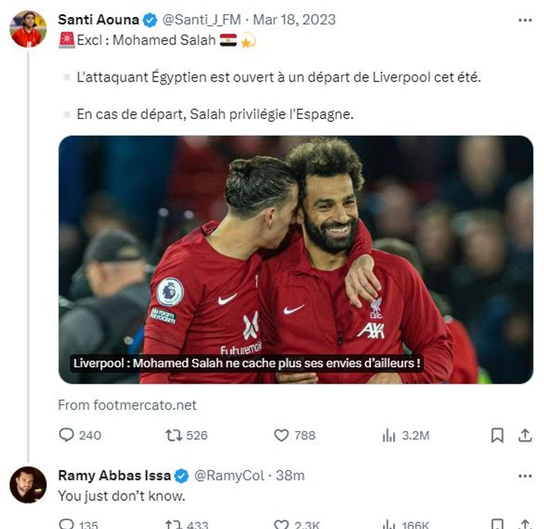 وجاء في الخبر الحصري لسانتي أونا آنذاك أن محمد صلاح منفتح لفكرة الرحيل عن ليفربول في الصيف (لعام 2023)، وفي حال مغادرة صفوف الفريق فإنه يفضل الانتقال إلى إسبانيا.