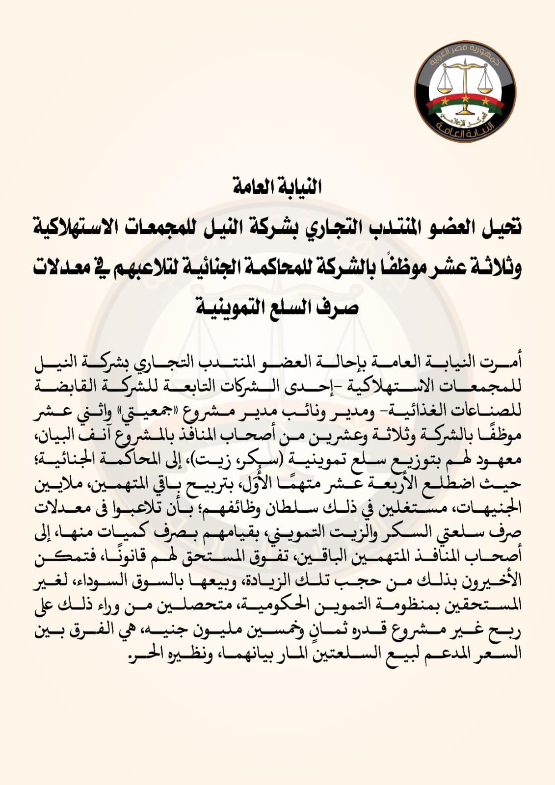 أمرت النيابة العامة بإحالة العضو المنتدب التجاري بشركة النيل للمجمعات الاستهلاكية -إحدى الشركات التابعة للشركة القابضة للصناعات الغذائية- ومدير ونائب مدير مشروع "جمعيتي" و12 موظفًا بالشركة وثلاثة وعشرين من أصحاب المنافذ بالمشروع آنف البيان، معهود لهم بتوزيع سلع تموينية "سكر، زيت"، إلى المحاكمة الجنائية.