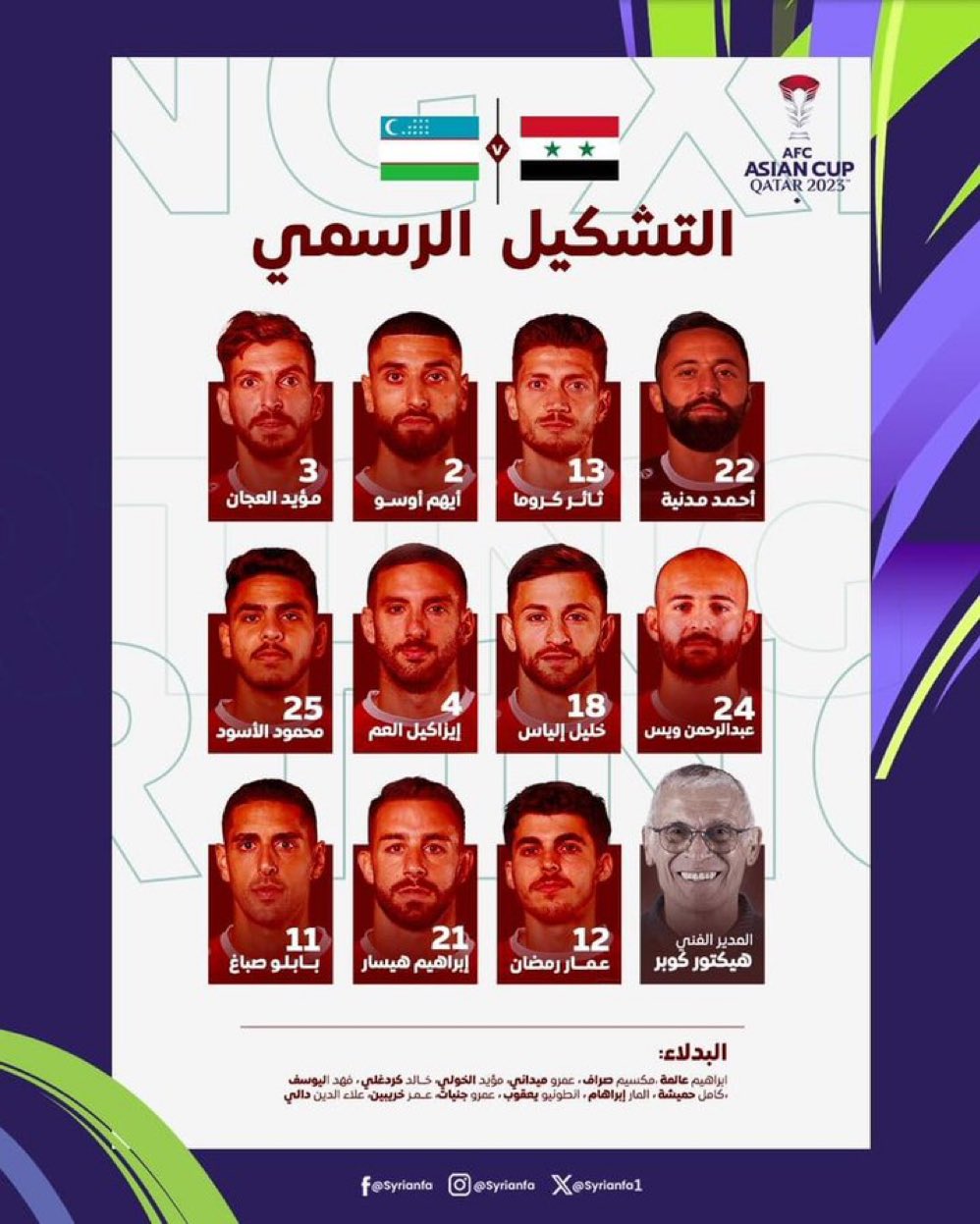 أعلن الأرجنتيني هيكتور كوبر المدير الفني لمنتخب سوريا، عن التشكيل الرسمي لمواجهة نظيره منتخب أوزبكستان، في افتتاح مشاورهما ببطولة كأس آسيا.