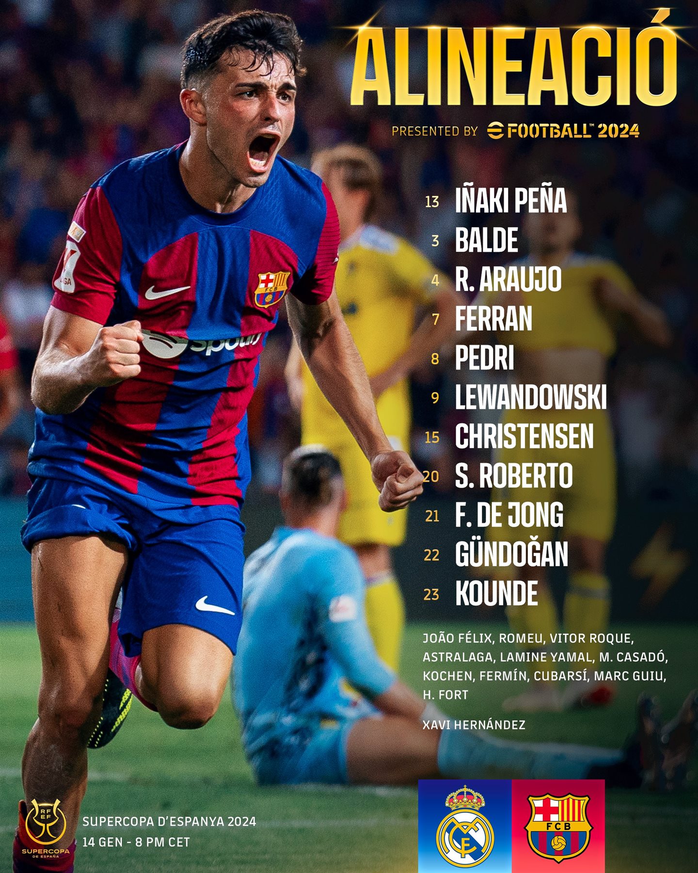 أعلن تشافي هيرنانديز المدير الفني لفريق برشلونة، تشكيل البارسا الذي سيخوض مواجهة ريال مدريد في نهائي كأس السوبر الإسباني.