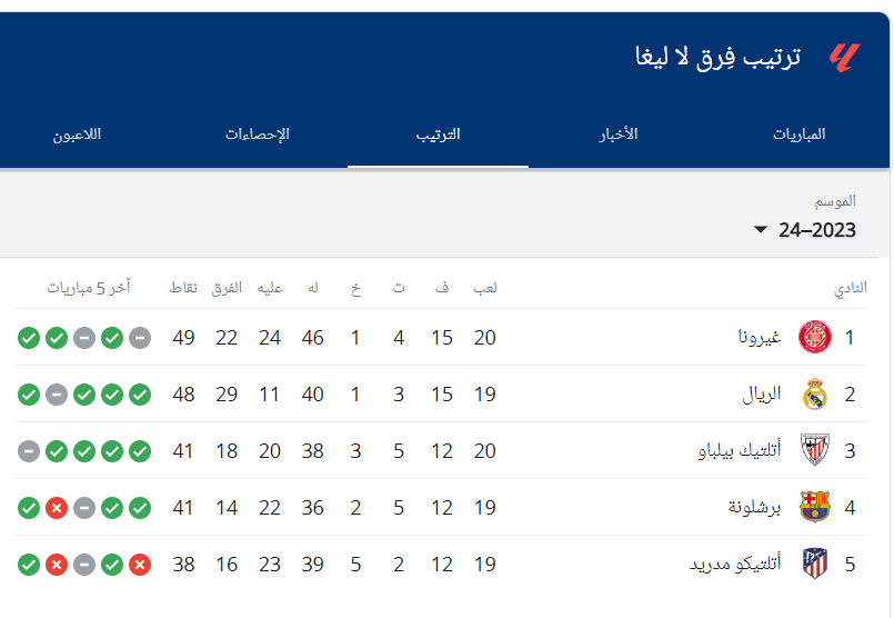 جدول ترتيب الدوري الإسباني La Liga حتي الآن