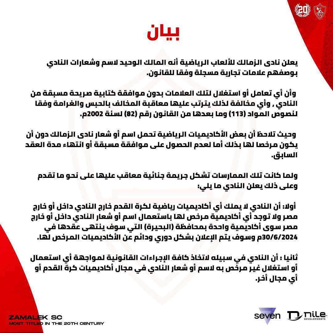 أولا: أن النادي لا يملك أي أكاديميات رياضية لكرة القدم خارج النادي داخل أو خارج مصر ولا توجد أي أكاديمية مرخص لها باستعمال اسم أو شعار النادي داخل أو خارج مصر سوى أكاديمية واحدة بمحافظة البحيرة، التي ينتهى عقدها في 30-6-2024، وسيتم الإعلان بشكل دوري ودائم عن الأكاديميات المرخص لها.