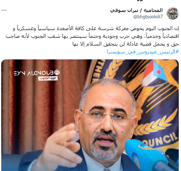 جاء ذلك في تغريدة على منصة أكس، بالتزامن مع مشاركة اللواء عيدروس الزبيدي بالمنتدى الاقتصادي العالمي بسويسرا.