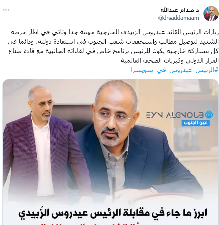 حيث أكد سياسيون بجنوب اليمن على أن أهمية زيارة اللواء عيدروس بن قاسم الزُبيدي، رئيس المجلس الانتقالي الجنوبي، القائد الأعلى للقوات المُسلحة الجنوبية، نائب رئيس مجلس القيادة الرئاسي باليمن، إلى سويسرا.