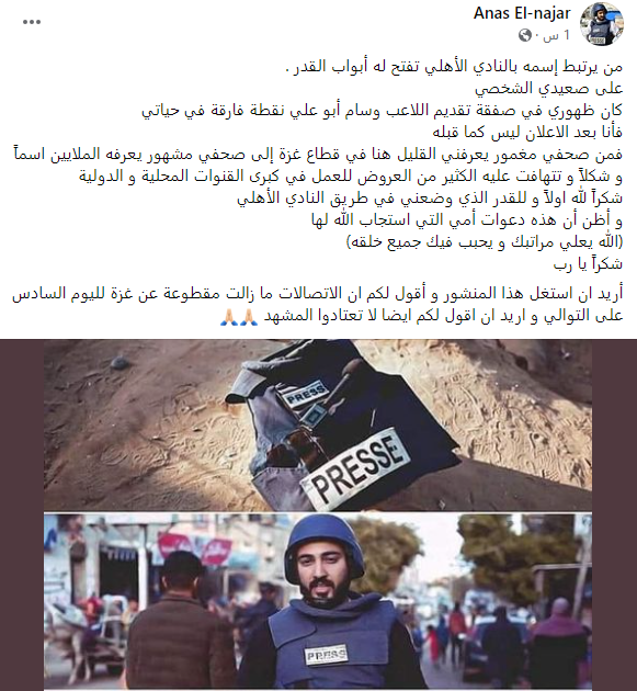 وكتب أنس، عبر حسابه الشخصي على موقع التواصل الاجتماعي "فيس بوك": "من يرتبط اسمه بالنادي الأهلي تفتح له أبواب القدر، على صعيدي الشخصي كان ظهوري في صفقة تقديم اللاعب وسام أبو علي نقطة فارقة في حياتي، فأنا بعد الإعلان ليس كما قبله، فمن صحفي مغمور يعرفني القليل هنا في قطاع غزة إلى صحفي مشهور يعرفه الملايين اسما وشكلًا وتتهافت عليه الكثير من العروض للعمل في كبرى القنوات المحلية والدولية".