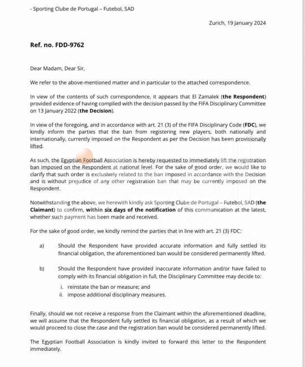 تلقى نادي نادي الزمالك المصري خطابا من الاتحاد الدولي لكرة القدم فيفا، برفع إيقاف القيد، عن النادي.