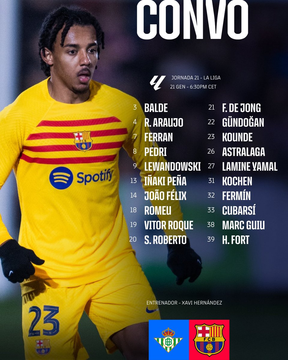 أعلن تشافي هيرنانديز، المدير الفني لفريق برشلونة، قائمة البارسا لمواجهة ريال بيتيس، ضمن منافسات الجولة الـ 21 من الدوري الإسباني "الليجا".