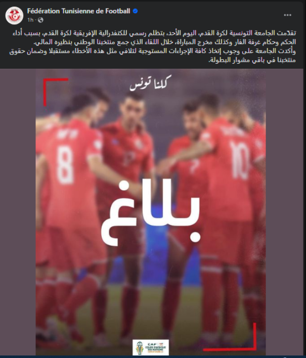 ونشر الاتحاد التونسي لكرة القدم عبر حسابه الرسمي على "فيسبوك" بيانًا رسميًا يقول فيه: "تقدّمت الجامعة التونسية لكرة القدم، اليوم الأحد، بتظلم رسمي للكونفدرالية الإفريقية لكرة القدم، بسبب أداء الحكم وحكام غرفة الفار، وكذلك مخرج المباراة، خلال اللقاء الذي جمع منتخبنا الوطني بنظيره المالي".