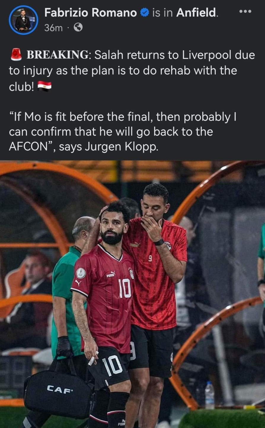 وكان محمد صلاح قد تعرض للإصابة في لقاء غانا بالجولة الثانية ضمن دور المجموعات بكأس أمم إفريقيا، وخرج مبكرًا في الشوط الأول متأثرا بإصابته.