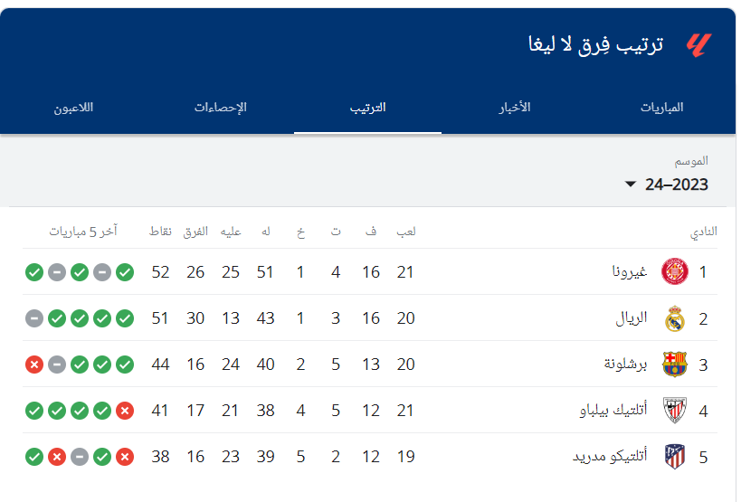 ترتيب الدوري الاسباني للموسم الحالي 2023/2024