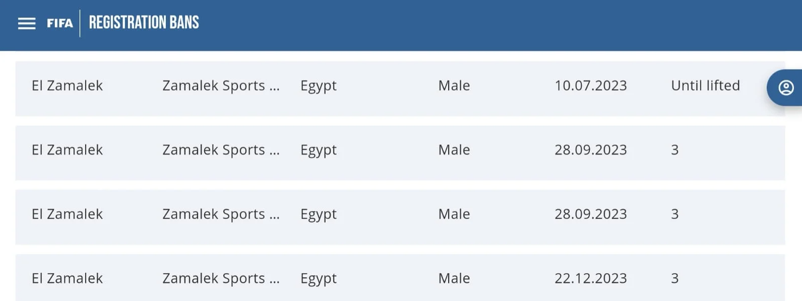 وعقب التحديث الأسبوعي للمنصة الخاصة بالقيد والتابعة للفيفا، ظهر استمرار إيقاف قيد الزمالك بسبب قضية واحدة بتاريخ 22-12-2023، والتي حُكم فيها بوقف القيد لمدة 3 فترات تسجيل.