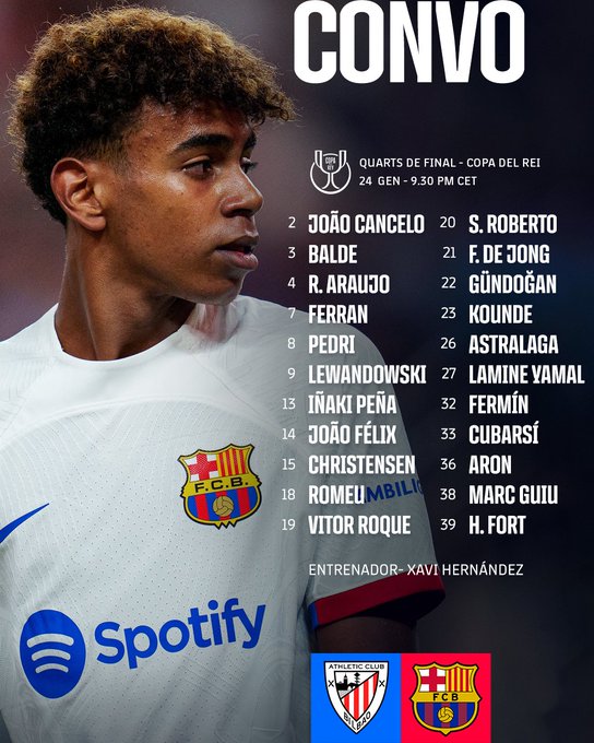 أعلن تشافي هيرنانديز، المدير الفني لفريق برشلونة، عن القائمة التي سيخوض بها مواجهة مضيفه أتلتيك بيلباو، مساء غدا الأربعاء، على ملعب "سان ماميس"، ضمن منافسات ربع نهائي كأس ملك إسبانيا.